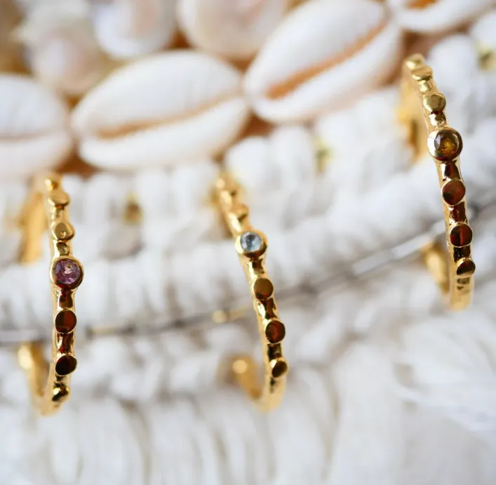 AMBAR 戒指鑲有多彩電氣石,這是一種能帶來內在平衡與喜悅的寶石。因寶石色彩各異,每一枚戒指都別具特色。