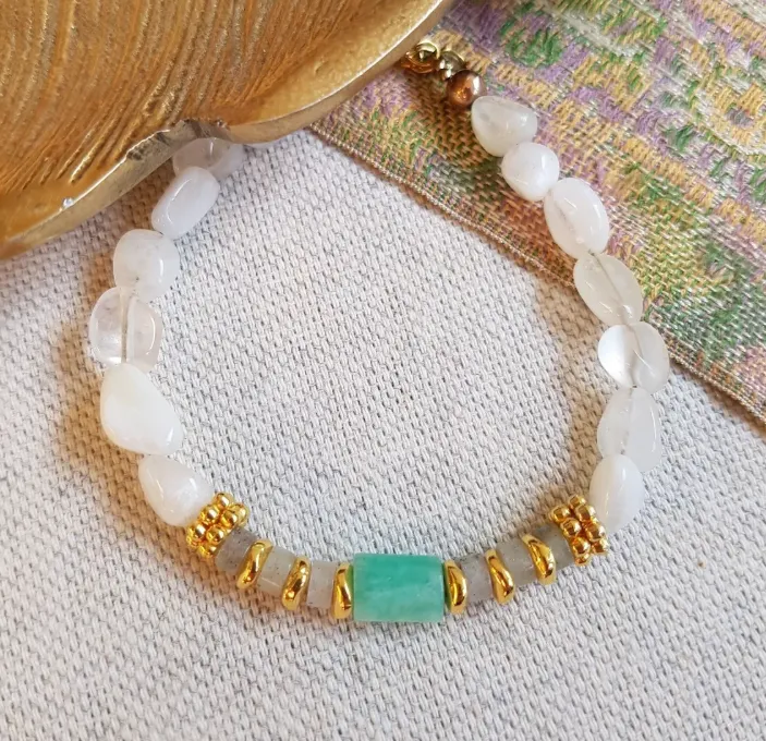手鍊由月光石、天河石以及鍍金精緻吊飾製成。