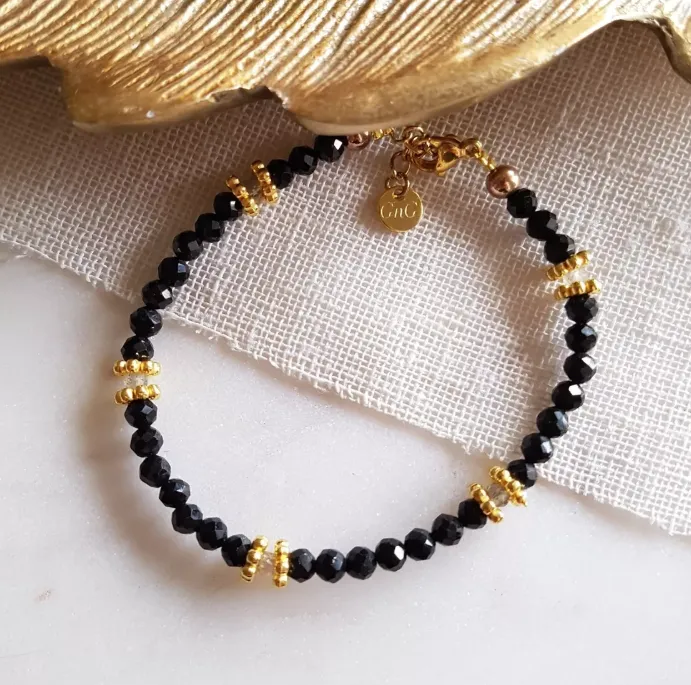 手鍊由4mm黑電氣石、拉長石與鍍金精緻吊飾組成。