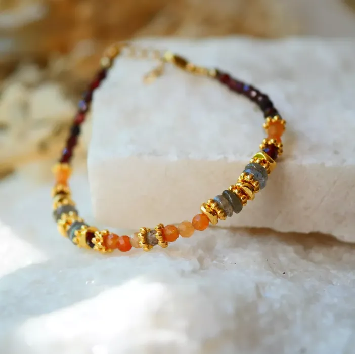 不鏽鋼手環,由石榴石、紅東陵玉、拉布拉多石與精緻金色吊飾組成。