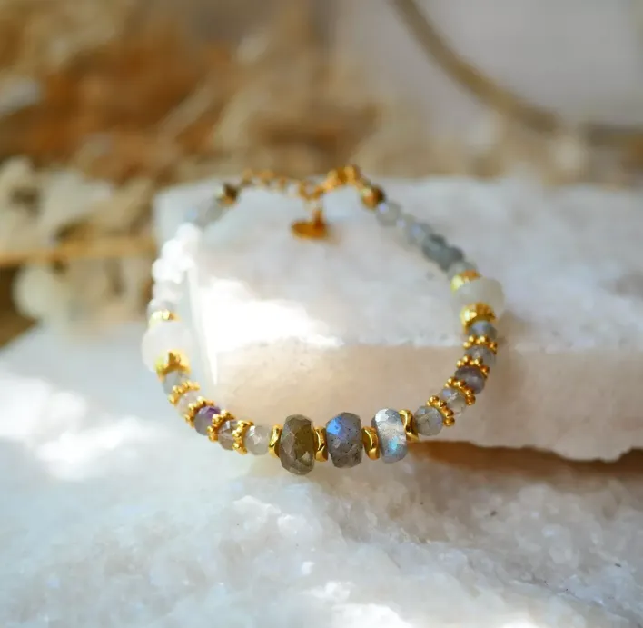 不鏽鋼手鍊,由拉不拉多石、紫水晶及鍍金精緻吊飾組成。