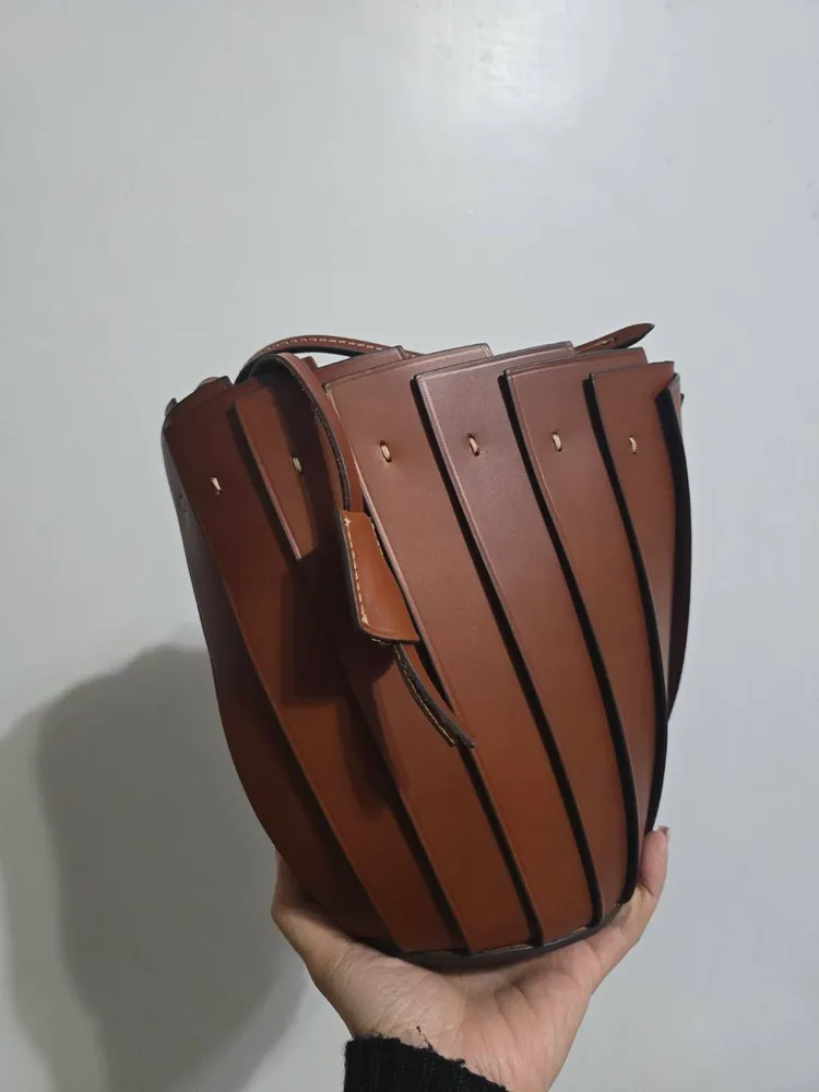這款鬱金香水桶訂製包, 束口水桶包型, 外部以漸層皮革工藝包覆宛如鬱金香花瓣的感覺